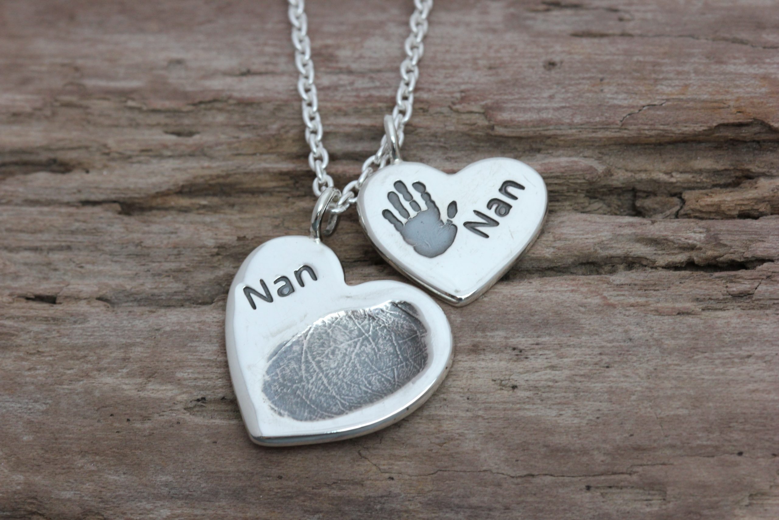 Silver heart shaped duo handprint and fingerprint pendant. The smaller one having a handprint and the larger one having a fingerprint.