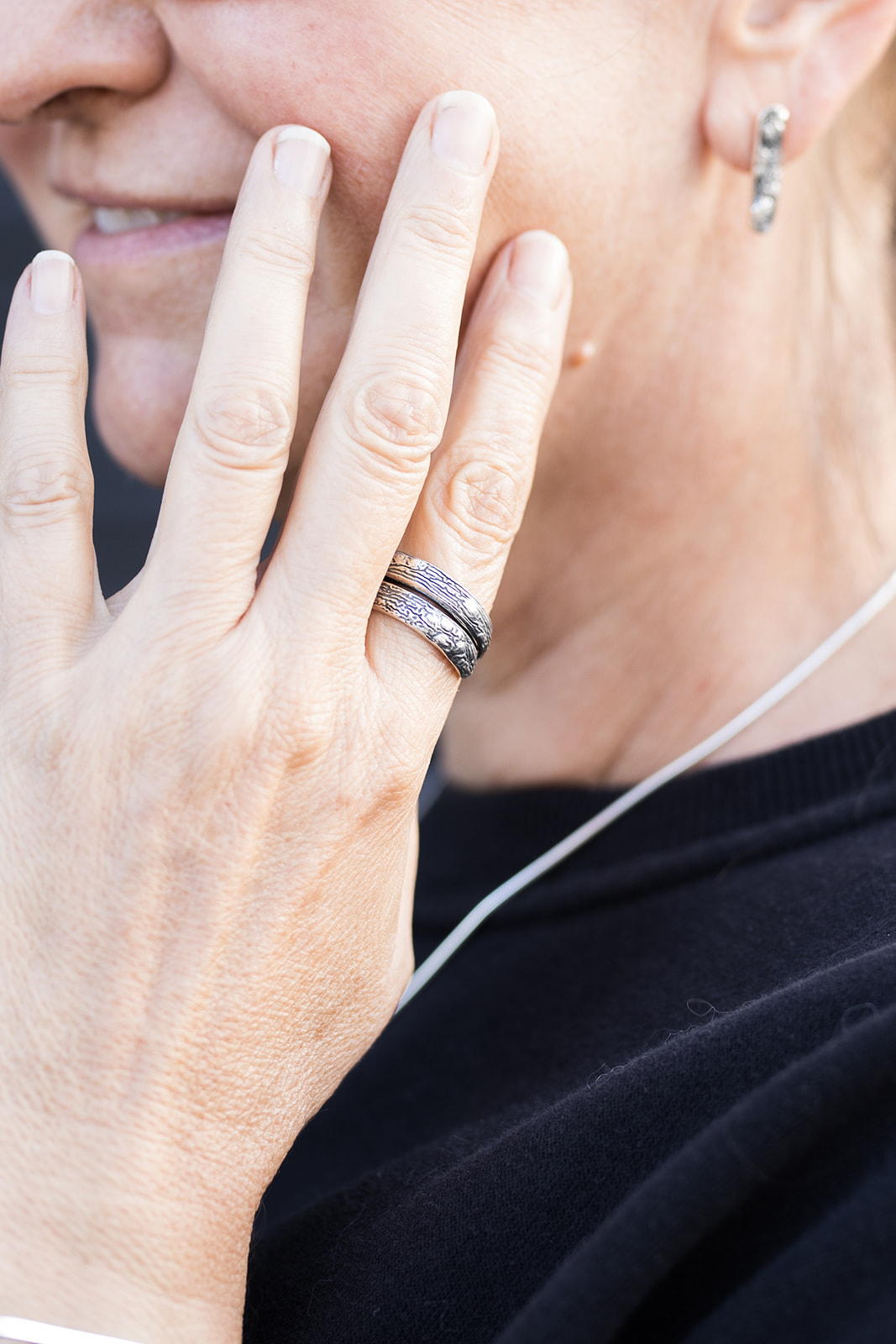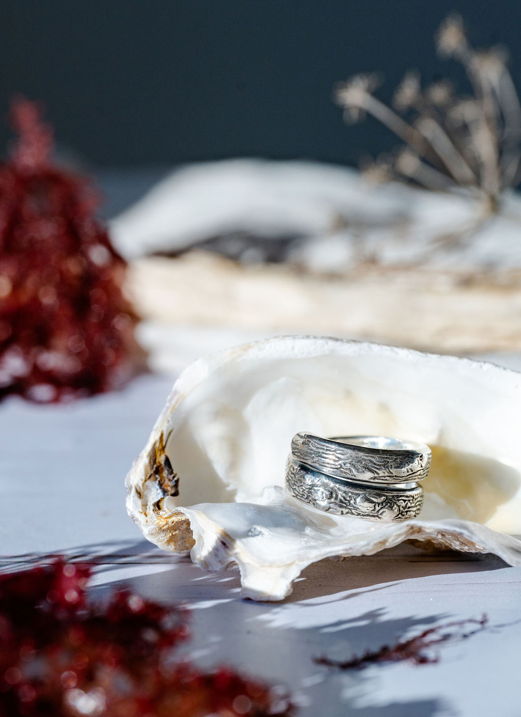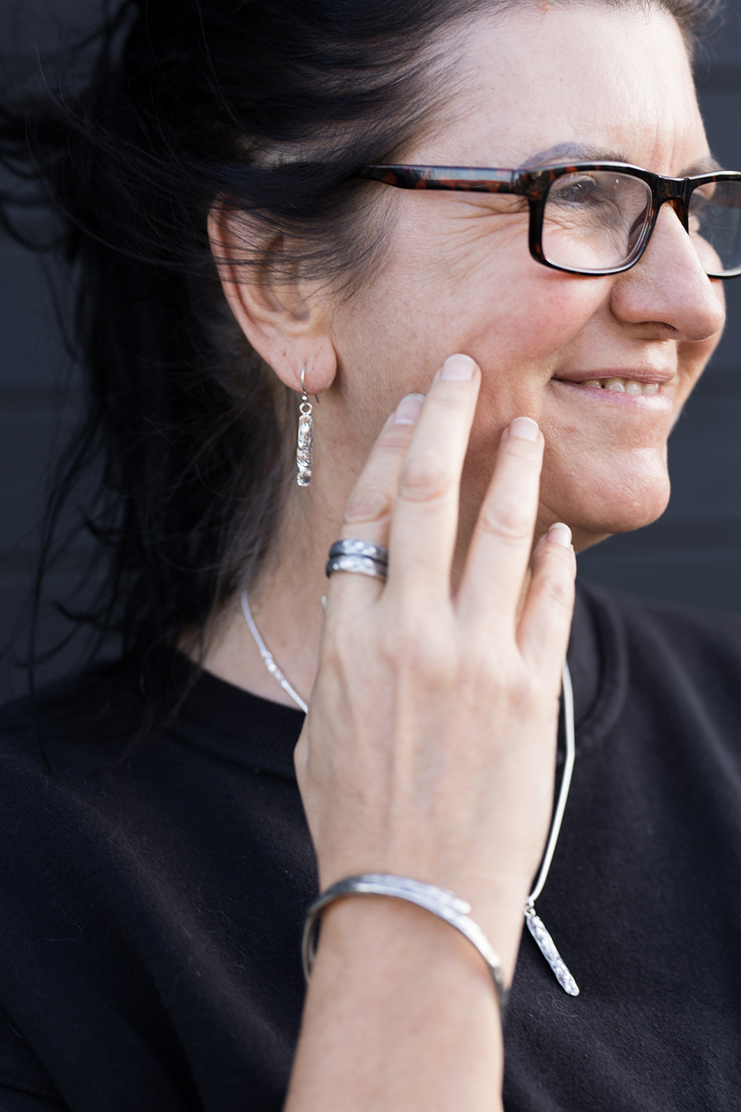 On a visit to the Folkestone Harbour Arm, the day after Storm Cierán in October 2023, I picked up a strand of seaweed that had been launched onto the walkway with the power of the stormy sea. I was amazed by the beauty of it’s natural organic texture and took a putty mould from it. From the mould, I created a silver cast of the strand and worked in a few simple designs to make it wearable. I discovered it is the Thongweed or Himanthalia Elongata variety, also known as Sea Spaghetti or Sea Thong. Available as a bangle, pendant, drop and stud earrings.