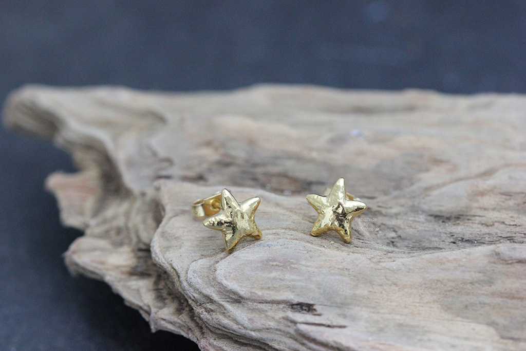 Starfish stud earrings, finished in 9ct gold vermeil. Size: 10mm Handmade in Folkestone using recycled sterling silver and plated with a 2.5 micron layer of 9ct gold.